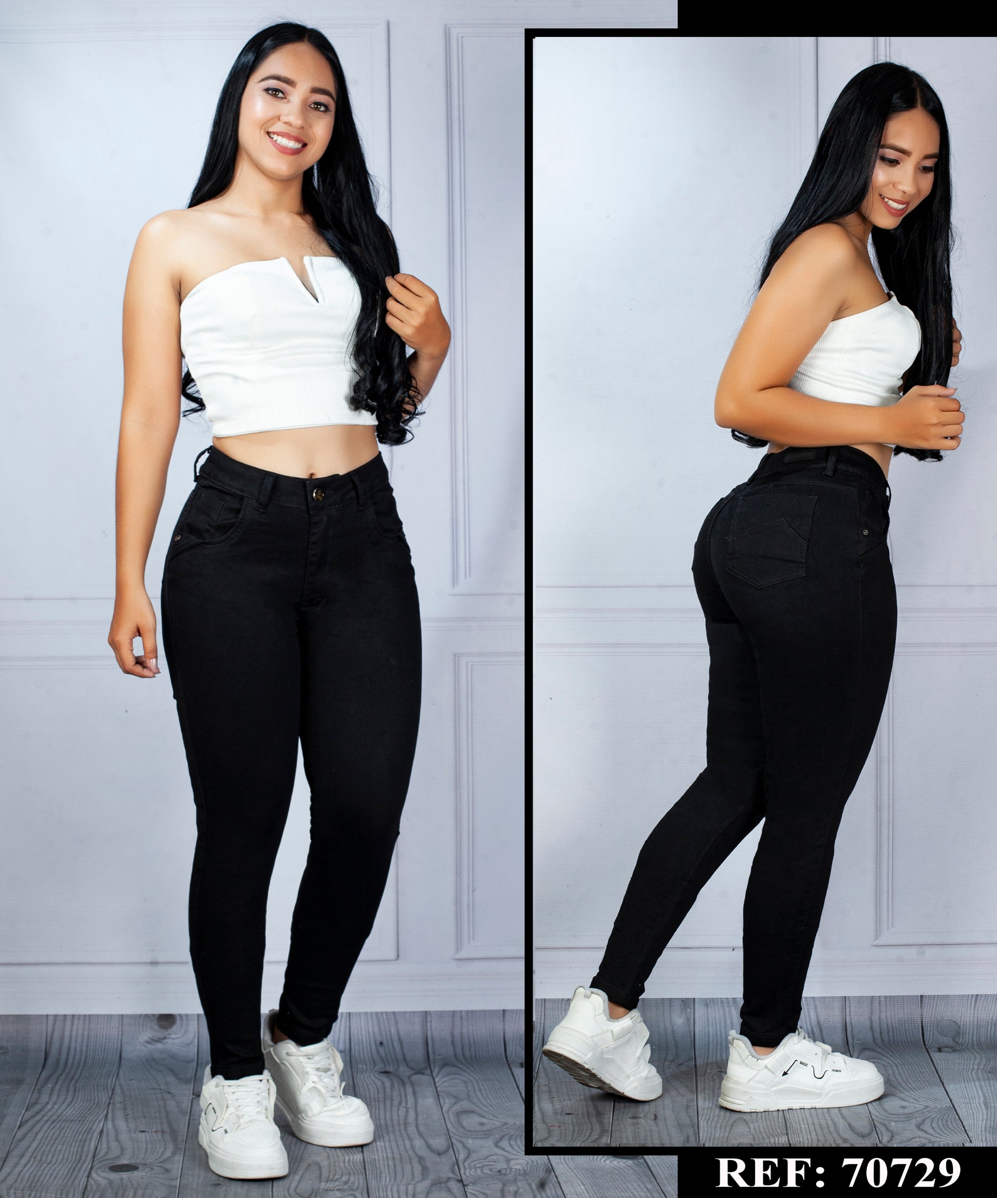 - Jean clásico en color negro, confeccionado en tela strech que se ajusta al cuerpo y realza la silueta sin perder comodidad. Diseño pegado hasta la rodilla con bolsillos traseros y pierna acampanada que aporta un estilo elegante y atemporal. Ideal para looks clásicos y versátiles, fácil de combinar con blusas, camisas o tops básicos para un outfit cómodo y sofisticado.
