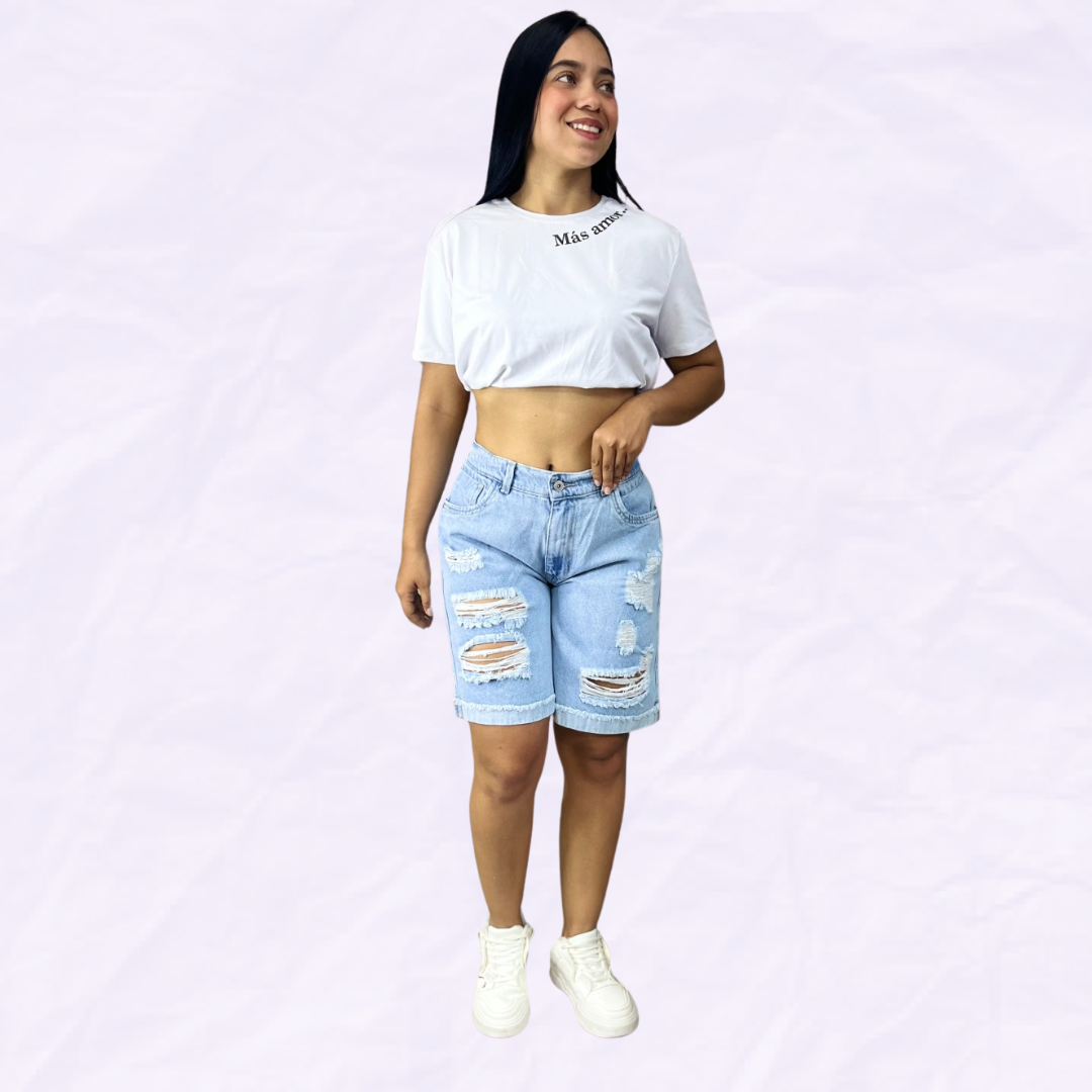 - Torero denim en tono azul con Detalle del bolsillo trasero hasta el costado. Su diseño relajado y corte a la rodilla ofrece comodidad y estilo ideal para looks casuales y veraniegos. Perfecta para combinar con blusas frescas, tops o camisetas básicas.